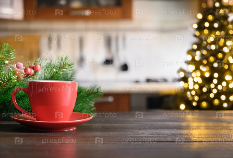 Новогоднее украшение на кухне и деревянная столешница для демонстрации или монтажа ваших продуктов