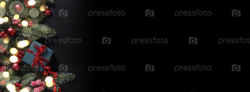 Рождественский зимний баннер с еловыми ветками, красные шары на черном фоне. Рождественская открытка
