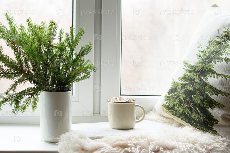 Натуральные еловые ветки как рождественская елка в вазе и чашка кофе на зимнем уютном подоконнике с подушкой и меховой кожей. Рождественский романтический угрюмый