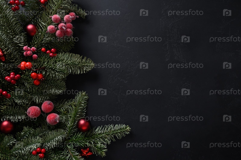 Рождественский зимний баннер с еловыми ветками, красные шары на черном фоне. Рождественская открытка