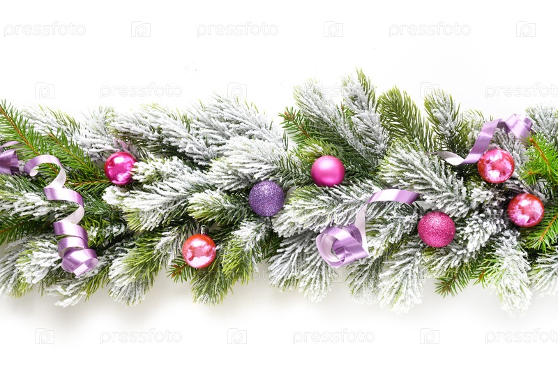 Рождественский баннер с фиолетовыми безделушками подряд на заснеженных вечнозеленых еловых ветвях, изолированных на белом фоне. Широкий размер. Рождественские традиционные украшения
