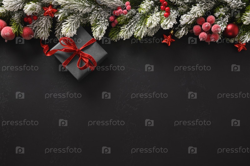 Рождественский зимний баннер с еловыми ветками, красные шары на черном фоне. Рождественская открытка