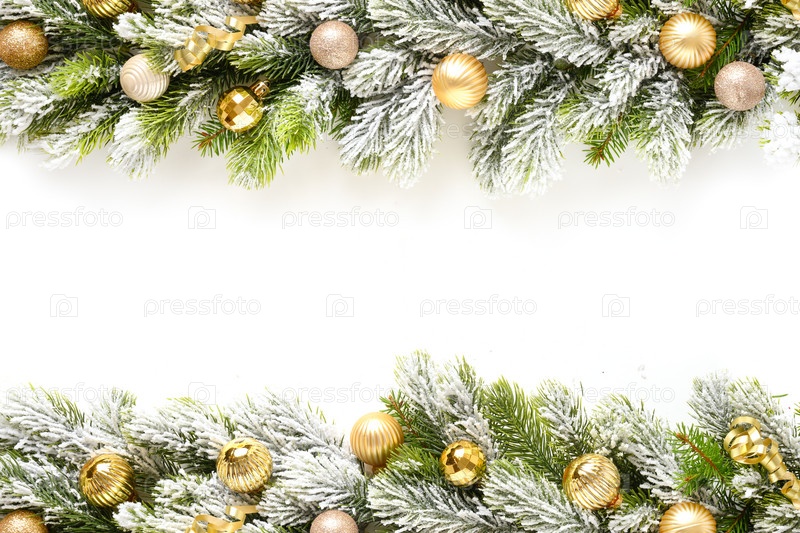 Рождественская рамка с золотыми безделушками на заснеженных вечнозеленых ветвях, изолированных на белом фоне. Скопируйте пространство. Вид сверху