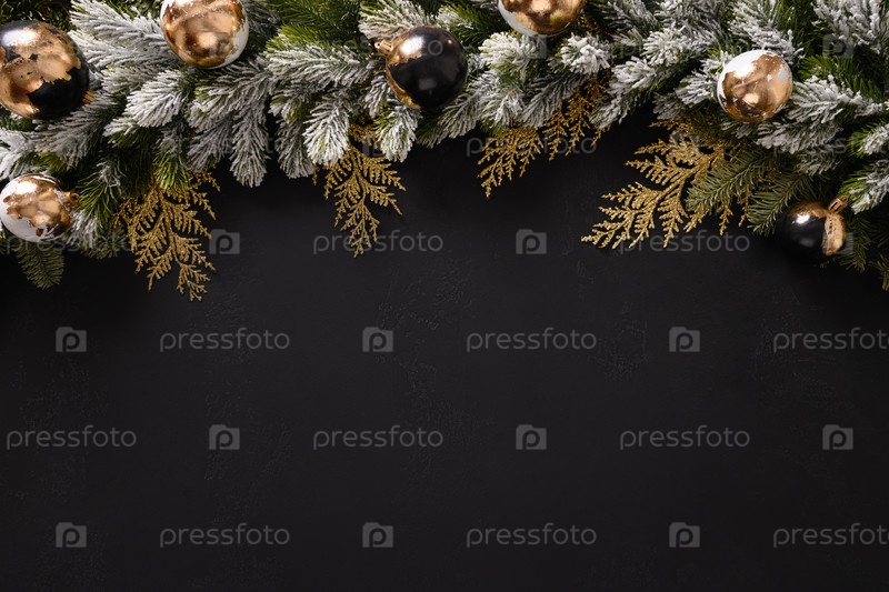 Рождественская рамка с золотыми позолоченными шарами, снежными еловыми ветками на черном фоне. Рождественская открытка. Праздничное время. С Новым Годом. Место для текста. Вид сверху, плоская планировка