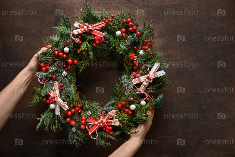 Рождественский венок из свежей натуральной еловой ветки с красными ягодами на коричневом фоне. Новый год. Рождественский праздник