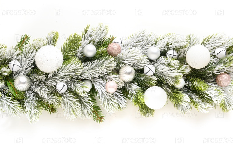 Рождественский баннер с белыми безделушками в ряд на заснеженных вечнозеленых ветвях