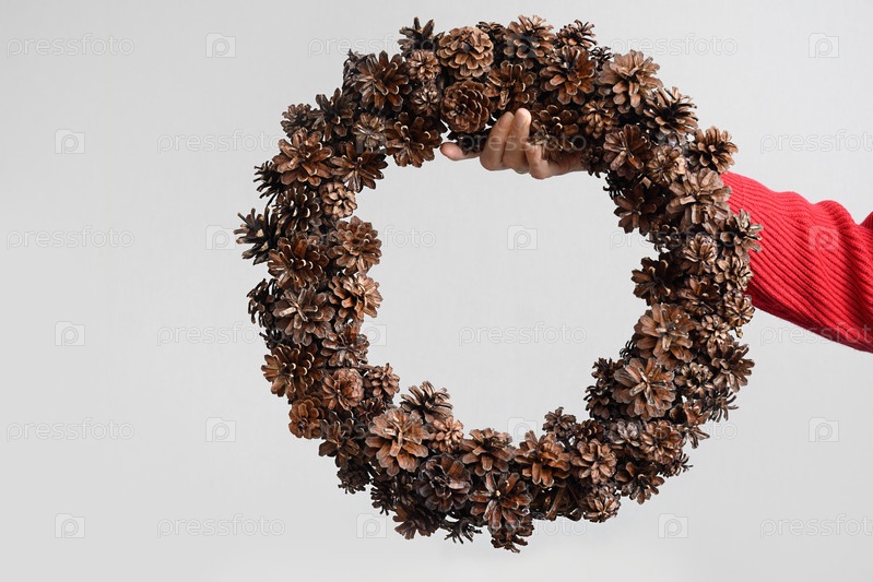Рождественский венок из натуральных сосновых шишек в руках женщины. Концепция экологически чистого рождественского праздника