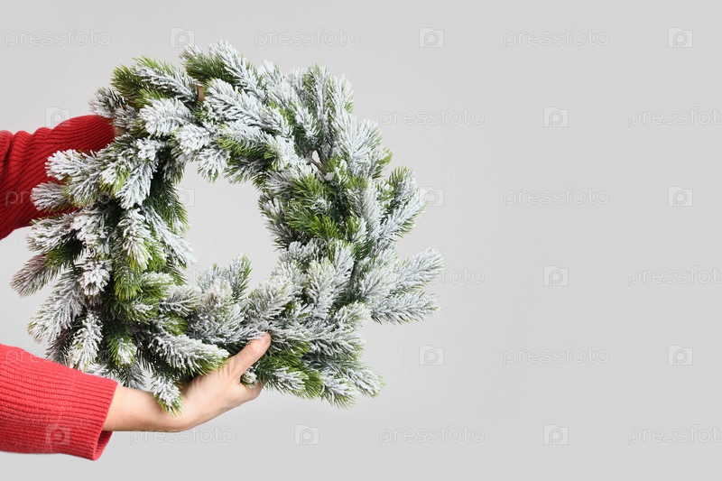 Женщина в красном свитере держит рождественский венок из еловой ветки на белом фоне