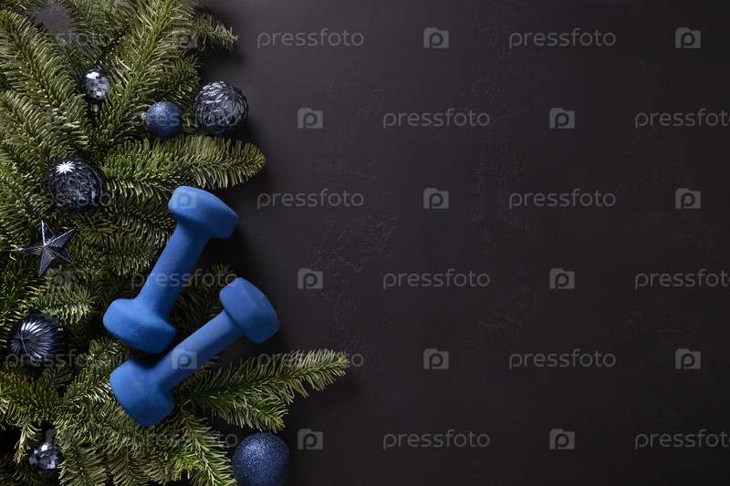 Рождественская открытка с двумя синими спортивными гантелями, еловыми ветками и подарком на черном фоне. Вид сверху с копией пространства. Фитнес, спорт и здоровая концепция. Рождественская спортивная композиция