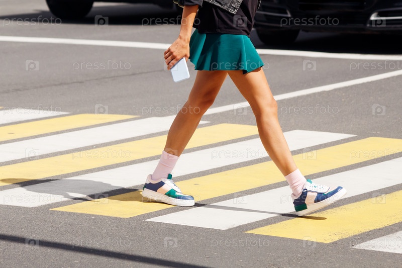 Люди переходят дорогу по пешеходному переходу. ноги крупным планом. на открытом воздухе в солнечный летний день