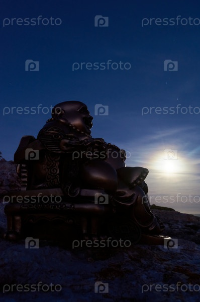 Фигура Будды под лунным светом на скале в море