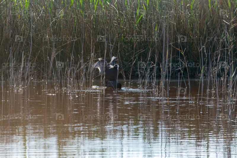 Обычная лысая, дикая птица в озере, с тростником и тростницей, спаривание ранней весной, естественная жизнь, Fulica atra,