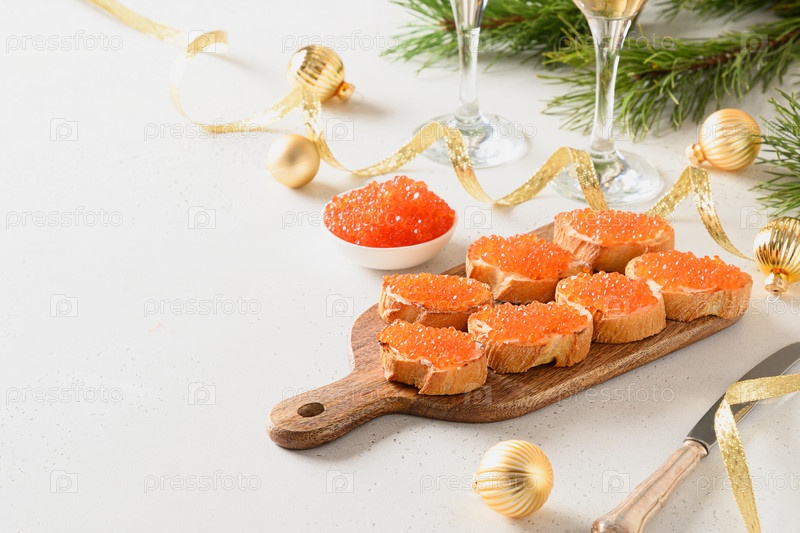 Канапе с красной икрой подается на деревянной разделочной доске на белом фоне на Рождество, новогодние праздники. Праздничная еда. Закрыть. Скопируйте пространство