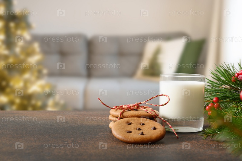 Рождественское домашнее печенье и стакан молока для Санты на праздничном столе. Рождественский праздник