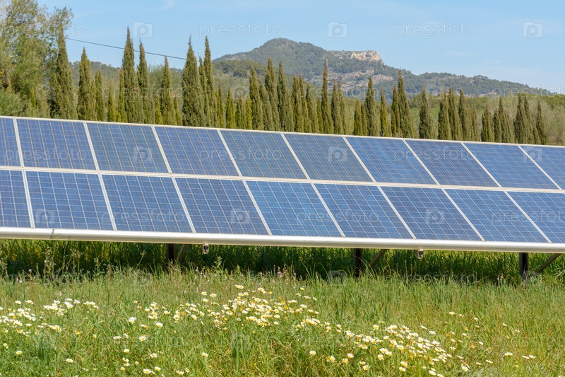 Солнечная электростанция на фоне голубого неба. Концепция альтернативной энергетики