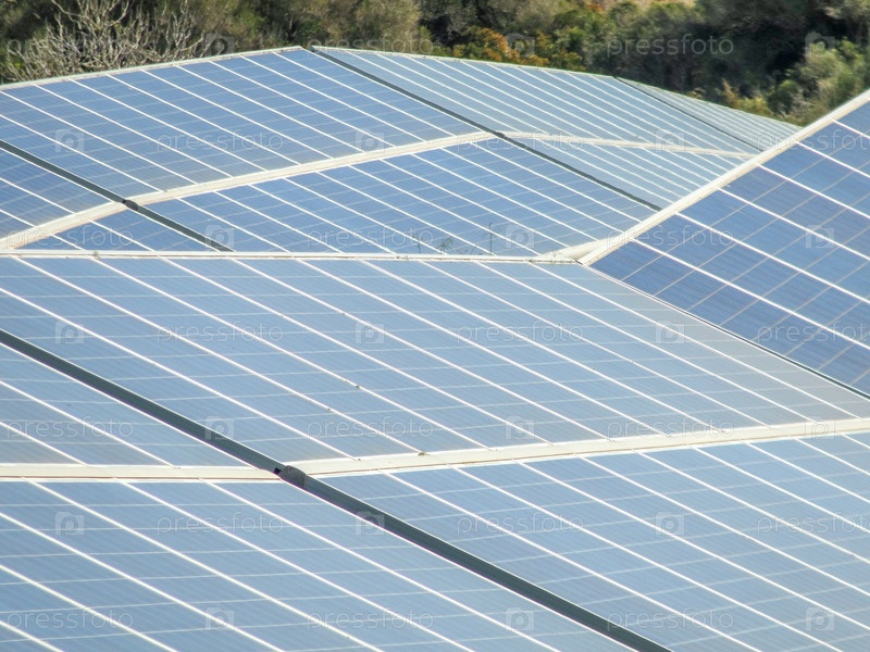Солнечная электростанция на фоне голубого неба. Концепция альтернативной энергетики
