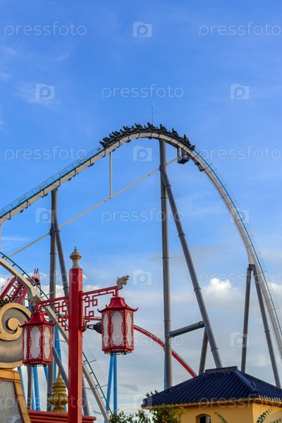 ТАРРАГОНА, ИСПАНИЯ - октябрь 2021: Шамбала - это стальные американские горки Hyper Coaster, расположенные в PortAventura в Салоу, Испания.Это второй по высоте (256 футов) и самый быстрый гиперкастер (134 км/ч) в Европе