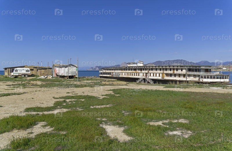 Старый заброшенный речной теплоход "Князь Багратион" дореволюционной постройки стоит на земле у берега моря. Капсельская бухта, Крым. Солнечный день в апреле