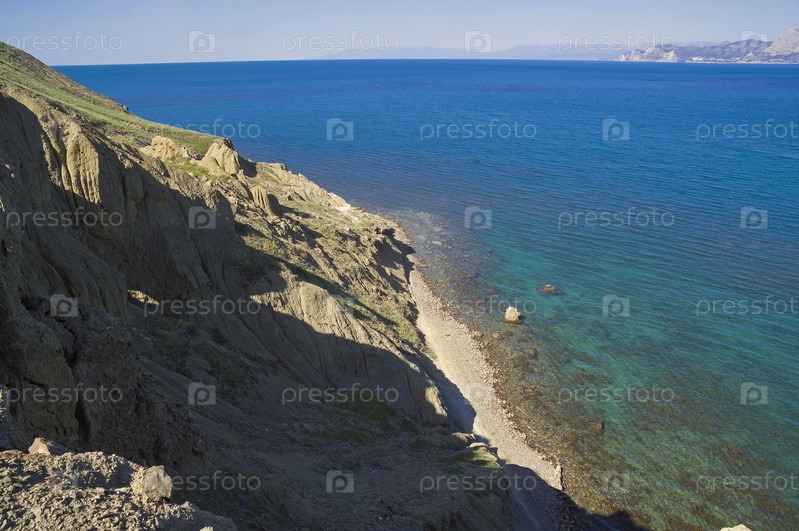 Следы эрозии почв и выветривания на крутом склоне мыса Меганом, обращенном к морю. Крым, солнечный день в апреле
