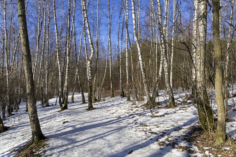 Обледеневшая дорожка в лесу, солнечный день в начале весны. Теплостановский лесопарк, Москва