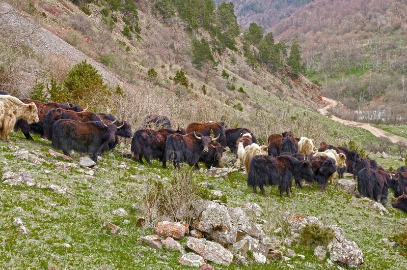Стадо яков не горном склоне. Долина реки Аксаут, Карачаево-Черкесия, Северный Кавказ, Россия