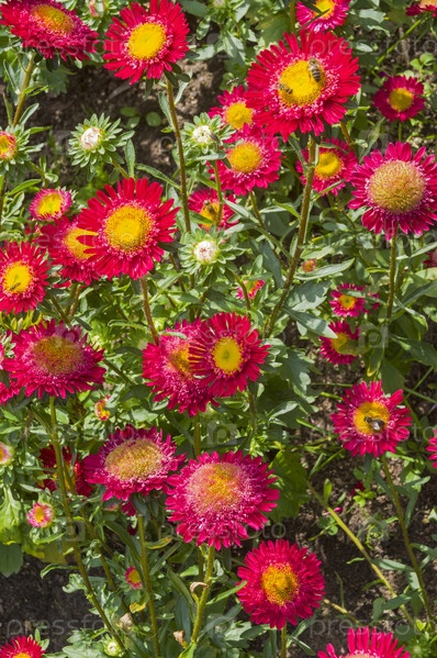 Цветущие красно-желтые астры (сорт "Внучка"). Солнечный день в сентябре