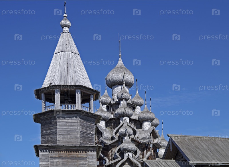 Купола и колокольня церкви Преображения Господня на фоне синего безоблачного неба. Остров Кижи, Онежское озеро, Карелия. Август