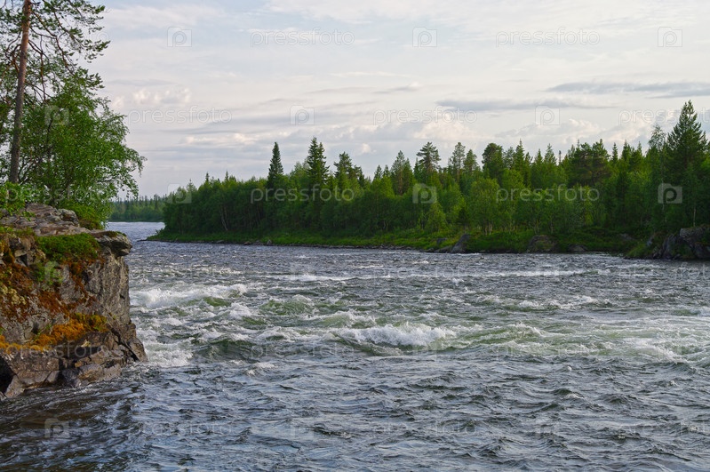 Финальная часть порога Падун на реке Умба, Кольский полуостров, Мурманская область. Солнечный день в августе