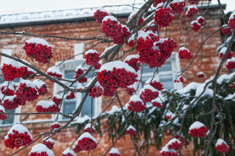 Заснеженный гроздья спелой рябины на фоне стены старого кирпичного дома. Декабрь