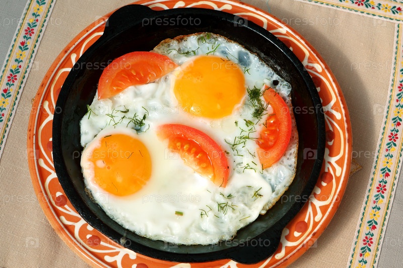 Жареная яичница с помидорами в порционной сковороде