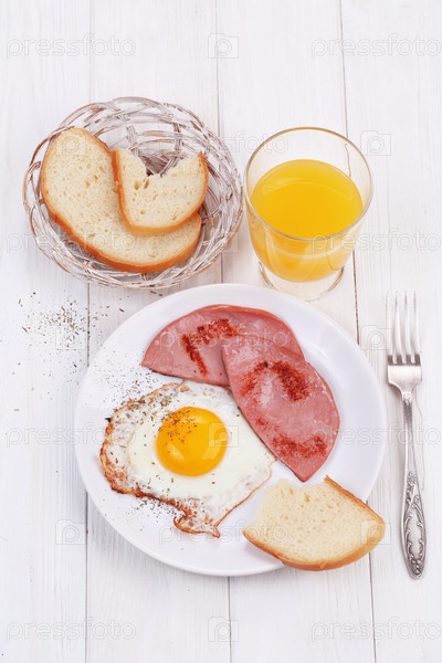 Жареная яичница с колбасой на белом фоне