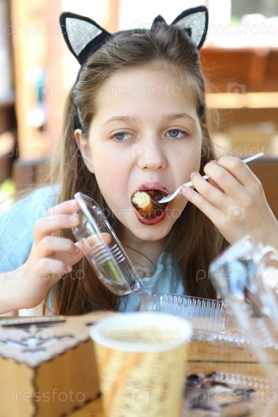 Девушка в кафе ест шоколадные пончики