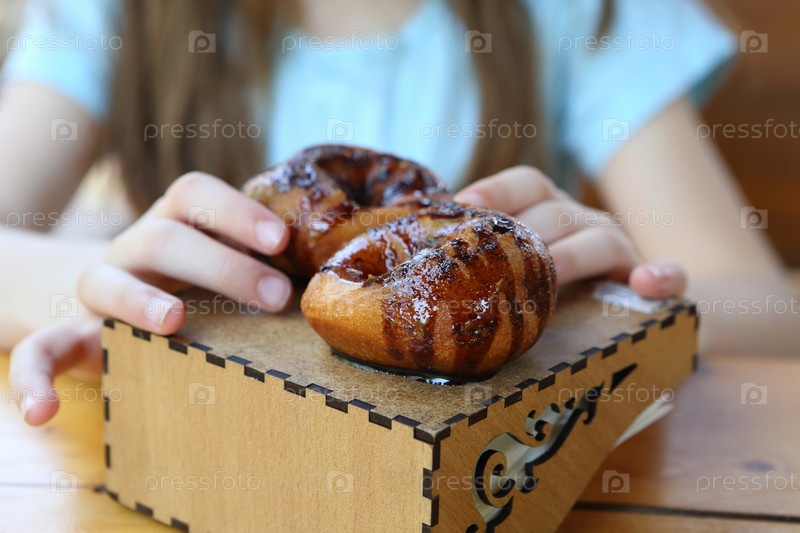Детские руки держат шоколадный пончик в кафе