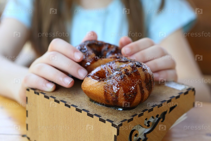 Детские руки держат шоколадный пончик в кафе