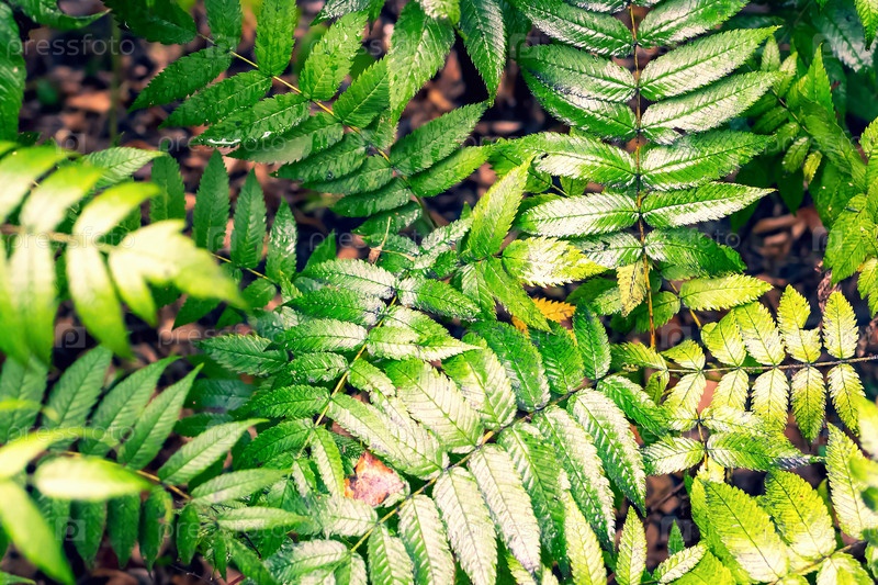 Мягкий фокус мокрых после дождя зеленых листьев на растении на темном фоне земли. Естественная текстура для дизайна и украшения. Тонированное изображение. Плоская планировка и вид сверху