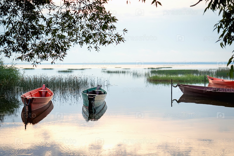 Мягкий фокус лодок на озере, стоящих на берегу в лучах заката