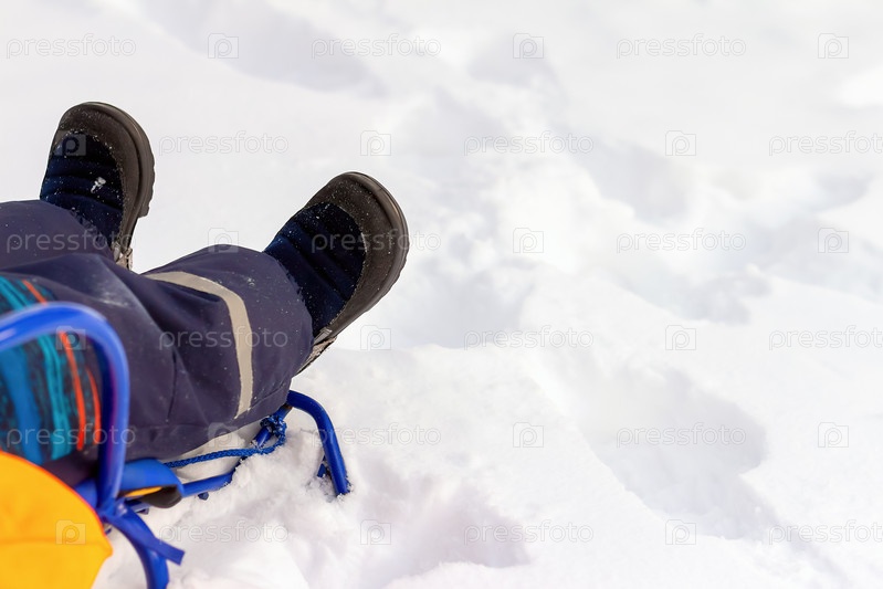Крупным планом ноги мальчика в черных зимних ботинках и теплых штанах, сидящего на санях на белом снегу. Концепция детских зимних развлечений, развлечений, спорта и прогулок на свежем воздухе