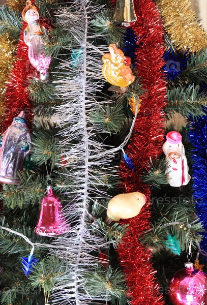 Игрушки на зеленой рождественской ели