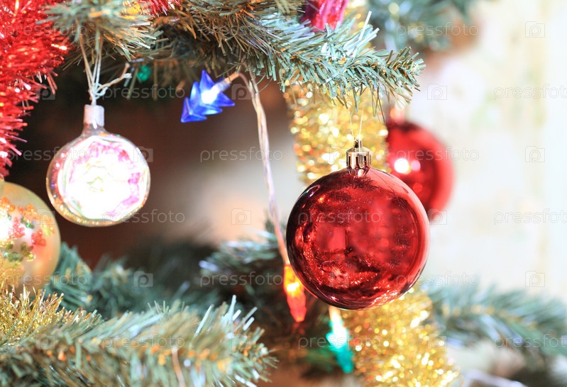 Игрушки на зеленой рождественской ели