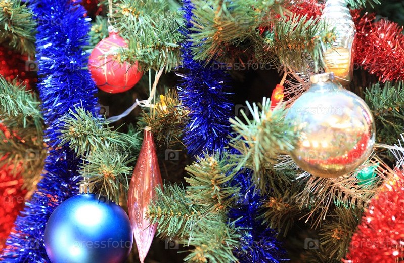 Игрушки на зеленой рождественской ели