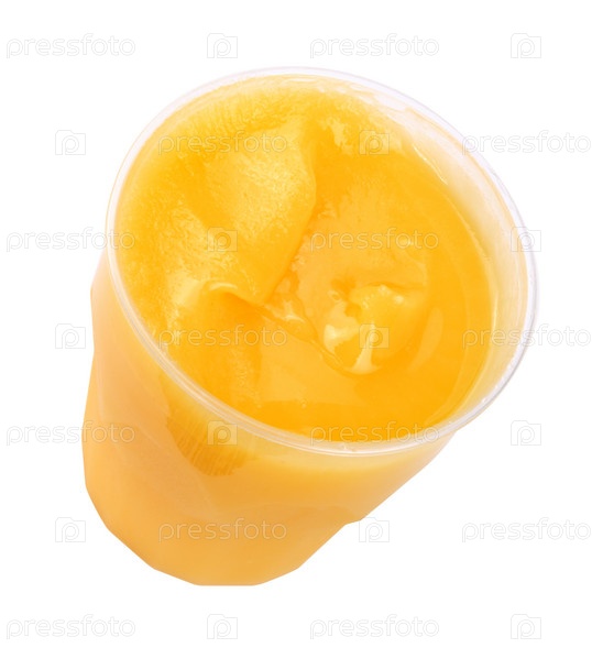 Желтый мед в пластиковом фигурном контейнере на белом фоне в сухой солнечный день