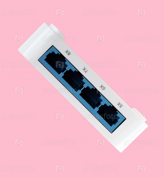 Белый 8-портный пластиковый коммутатор Ethernet изолирован на розовом фоне в сухой день