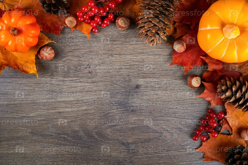 Осенний фон с кленовыми листьями, тыквами, шишками, каштанами и рябиной