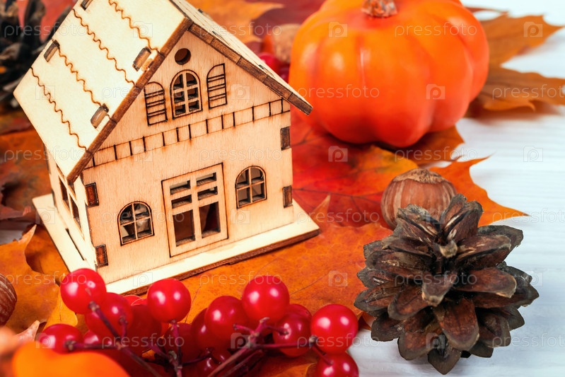 Осенний фон с деревянным домом, кленовыми листьями, тыквами, шишками, каштанами и рябиной