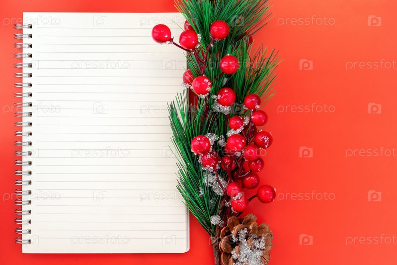 Блокнот для планирования целей на новый год, список желаний или покупок на красном фоне и ветка рождественских ягод рябины