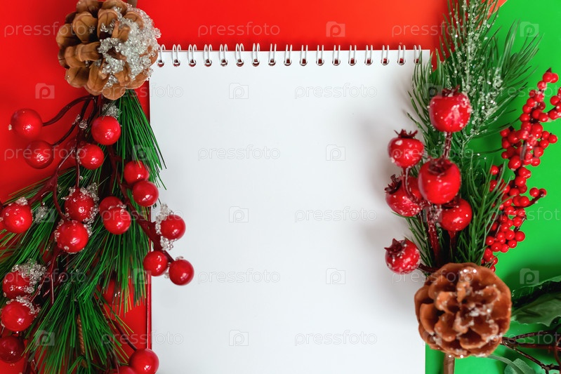 Блокнот с пустыми белыми листами для планирования целей на новый год, желание или список покупок на красном и зеленом фоне. Игрушечные ветки елки с ягодами рябины и льдом. Макет с копией пространства