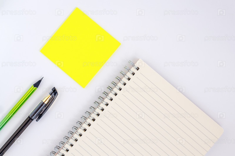 Тетрадь с листами с линиями и пружиной, желтыми ручками, черной ручкой и зеленым карандашом