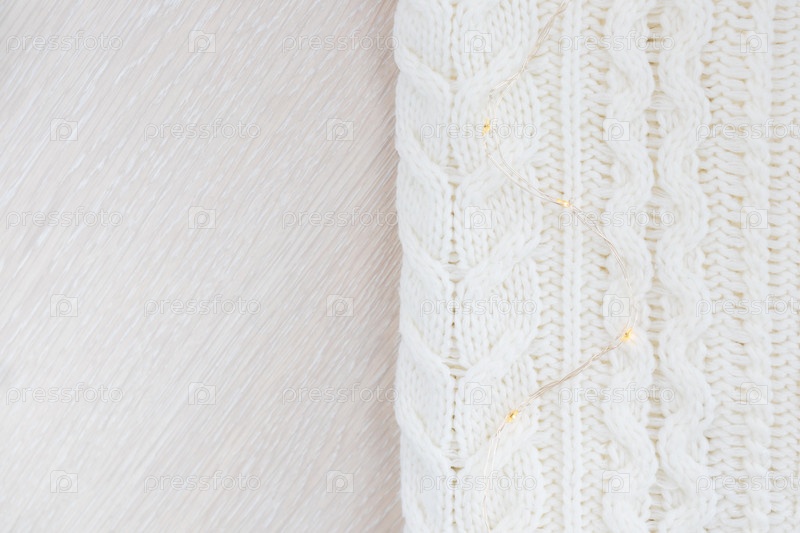 Вязаный свитер и светящаяся гирлянда на светлом деревянном фоне