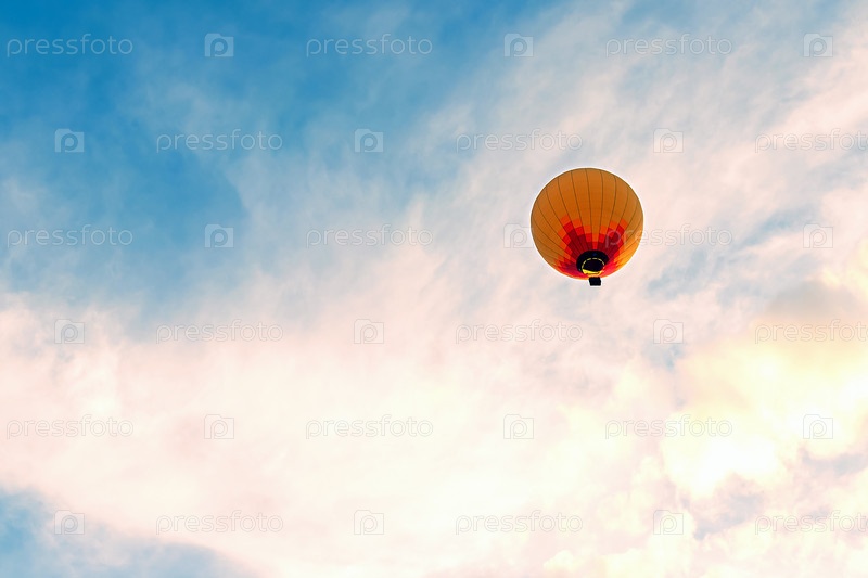 Яркий воздушный шар на фоне голубого неба с белыми облаками и закатным светом. Концепция полетов, путешествий и свободы