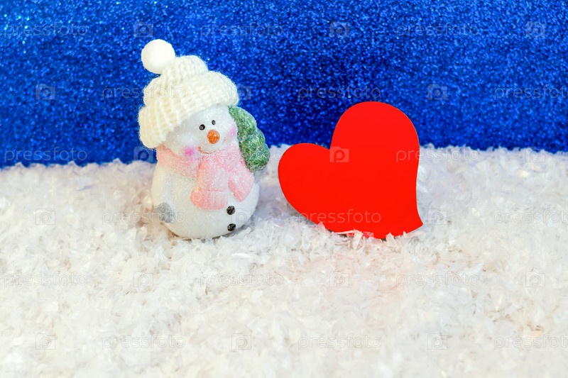 Крупным планом снеговика с ярко-красным сердцем на синем блестящем фоне со снегом. Концепция праздника Дня Святого Валентина, романтического подарка и сюрприза